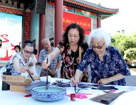 人民網(wǎng)北京6月30日電 6月30日上午,石景山區(qū)八角街道舉辦“百米畫卷繪初心”——老街坊手繪畫卷獻(xiàn)禮黨的生日活動(dòng),百余名老街坊揮毫潑墨祝福黨的生日,生動(dòng)地描繪出對黨對祖國的深情厚意。