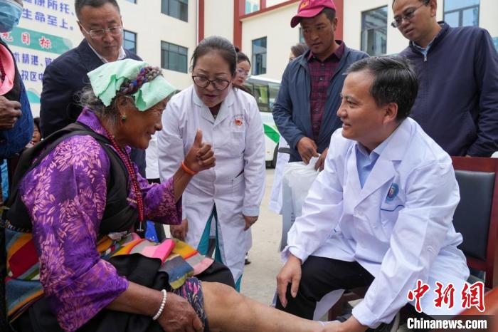 圖為青島醫(yī)療專家團隊在日喀則為62歲的倉木拉老人進行診斷,倉木拉對援藏醫(yī)療專家豎起大拇指。王建亮 攝