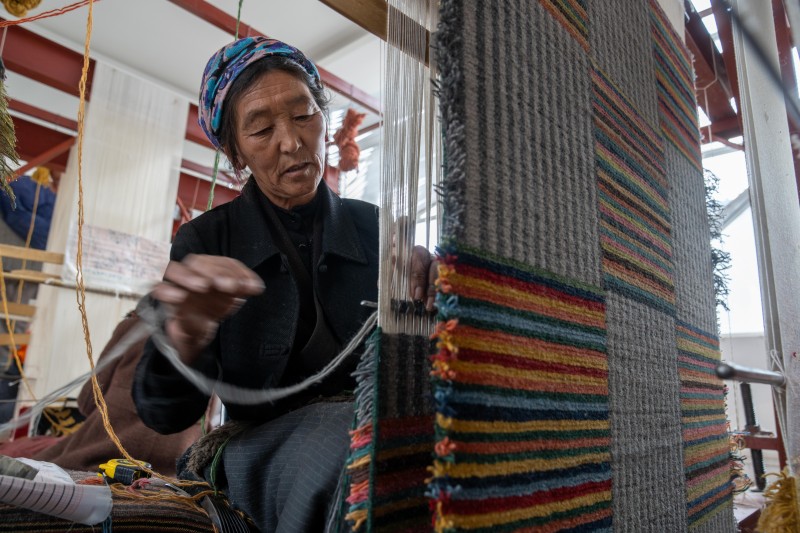 2月22日,一名婦女在編織藏毯。西藏山南市瓊結(jié)縣通過援藏力量招商引資,成立公司生產(chǎn)純手工藏毯,同時還聘請藏毯手工藝人,為當(dāng)?shù)厝罕娊淌诰幙椉妓嚕貙掁r(nóng)牧民增收渠道。新華社記者 旦增尼瑪曲珠 攝/新華社圖片庫