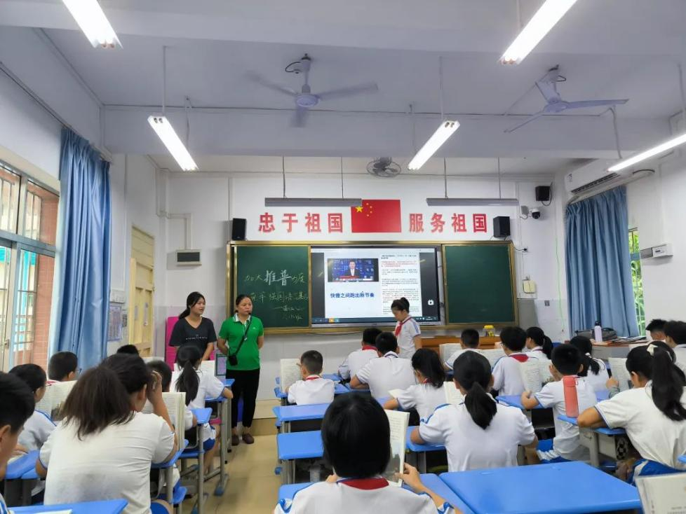 21級(jí)實(shí)習(xí)生戴鈺瑩在湛江市第四小學(xué)舉辦推普活動(dòng),將紅色經(jīng)典與傳統(tǒng)文化教育相結(jié)合,通過誦讀《西江月·井岡山》和《三字經(jīng)》,讓學(xué)生感受到革命先烈的英勇無畏,傳承了中華民族的傳統(tǒng)美德與智慧,增強(qiáng)了文化自信與民族自豪感。