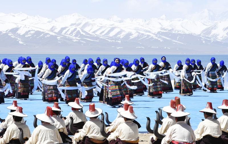 5月19日,在距拉薩市區(qū)240公里、海拔4718米的納木措湖邊,一場盛大的“開湖日”活動,將西藏“圣湖”納木措的美展現(xiàn)在國內(nèi)外約200名賓客眼前。圖為舞蹈演員在納木錯開湖活動現(xiàn)場表演。記者 旦增蘭澤 攝
