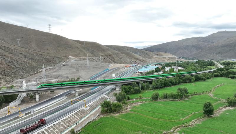 6月30日,G4218雅安至葉城國家高速公路拉薩至日喀則機場段項目建成通車。圖為318國道 、拉日鐵路 、拉日高等級公路 交錯并行。記者 索朗群培 次旦央吉 扎西頓珠