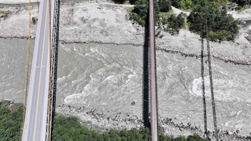 1954年12月25日川藏、青藏公路同時通車?yán)_,西藏日報聯(lián)合四川日報、青海日報開展的“大道向前 天路放歌——紀(jì)念‘兩路’建成通車70周年”聯(lián)合采訪。圖為8月20日記者在通麥鎮(zhèn)拍攝的橫跨在易貢藏布之上的不同年代的三座橋。西藏日報四川日報川藏線聯(lián)合報道組攝