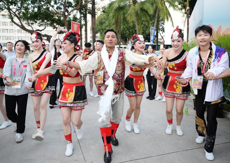 11月22日,由國家民委和國家體育總局主辦、海南省人民政府承辦的第十二屆全國少數(shù)民族傳統(tǒng)體育運動會在海南三亞開幕。圖為第十二屆全國少數(shù)民族傳統(tǒng)體育運動會西藏代表團(tuán)民族健身操運動員賽后與福建代表團(tuán)運動員一起跳鍋莊。