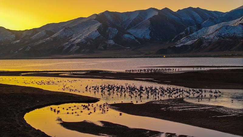 11月14日,拉薩市林周縣虎頭山水庫旁,一群黑頸鶴正悠閑的曬著太陽。晉巴次成 攝