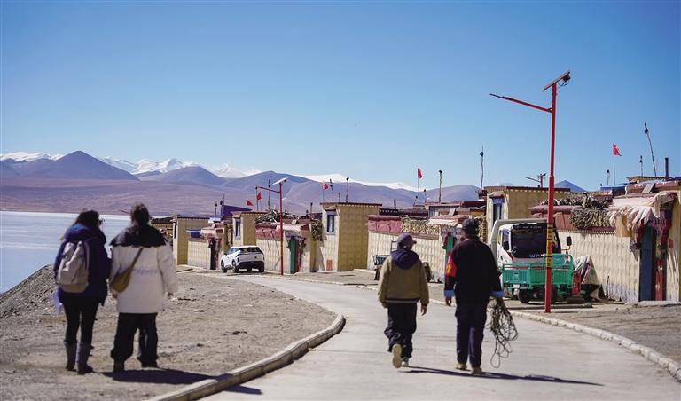 浪卡子縣打隆鎮(zhèn)推瓦村,南部與不丹接壤,邊界線長(zhǎng)達(dá)25公里,是世界上海拔最高的純牧業(yè)行政村之一。全村共有40戶人家,153位村民在此生活。2月6日,記者踏入推瓦村,首先映入眼簾的是遠(yuǎn)處的普姆擁措湖,湖面在陽(yáng)光的照耀下波光粼粼,與錯(cuò)落有致的雪山相互映襯,構(gòu)成一幅絕美的畫面。沿著平坦的柏油馬路前行,道路兩旁整齊排列的路燈和一排排以溫馨黃色為主色調(diào)的邊境小康房格外引人注目。漫步在臨近冰湖的村路上,悠然愜意之感油然而生,雪山、湖泊、村落與村民們和諧相融,共同繪就了一幅寧?kù)o祥和的鄉(xiāng)村畫卷。