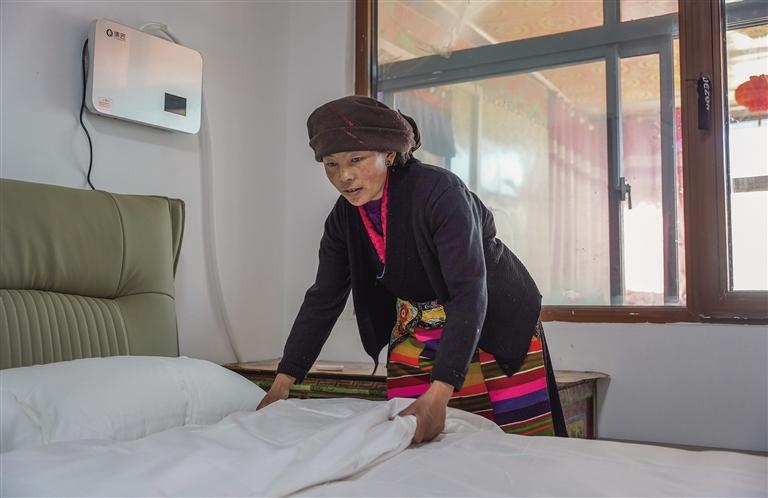 倫珠曲珍在“暖心房”整理被子。