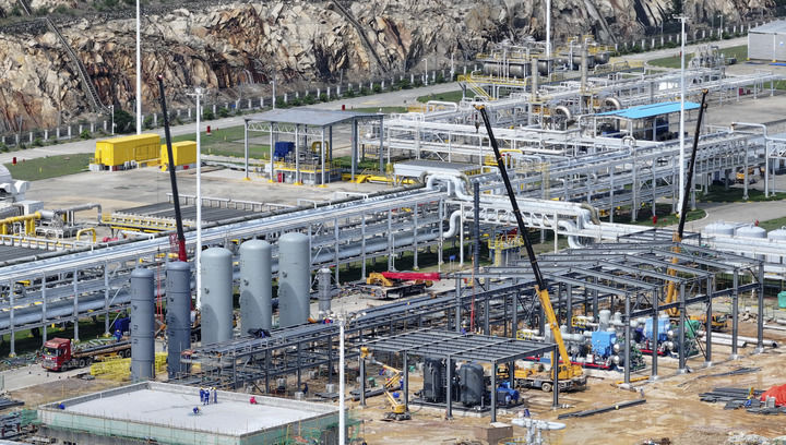 這是2024年6月21日拍攝的位于珠海經(jīng)濟(jì)開(kāi)發(fā)區(qū)的中海石油深海開(kāi)發(fā)有限公司二氧化碳回收利用項(xiàng)目塔器安裝現(xiàn)場(chǎng)。新華社發(fā)(邱婷 攝)