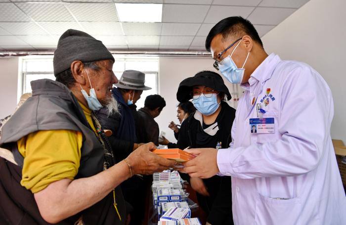 圖為2022年6月9日,時(shí)任拉薩市人民醫(yī)院院長(zhǎng)、北京市第七批醫(yī)療人才“組團(tuán)式”援藏醫(yī)療隊(duì)隊(duì)長(zhǎng)孫樹學(xué)(前排右)在拉薩市當(dāng)雄縣格達(dá)鄉(xiāng)為群眾義診發(fā)藥 受訪者供圖