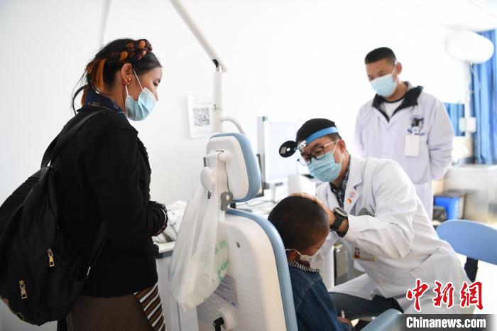 上海五官科醫(yī)院耳鼻喉科醫(yī)生曹鵬宇給藏族小朋友診病?!O國根 攝