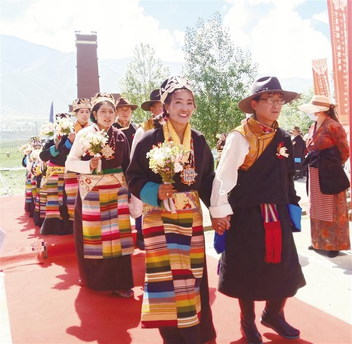 6月28日,寧墨情深·禮贊百年——愛在墨竹百對佳人集體婚典在拉薩市墨竹工卡縣甲瑪鄉(xiāng)松贊干布紀念館盛大舉行,百對佳人迎建黨百年、結百年姻緣。