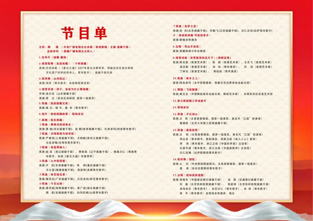為展現援藏工作成就,弘揚援藏精神,表達西藏各族干部群眾對習近平總書記和黨中央的親切關懷、全國人民無私支援特別是對援藏干部人才的敬意和感恩之情,由自治區(qū)黨委宣傳部、自治區(qū)黨委組織部共同主辦的援藏主題晚會《哈達獻給您》將于8月18日晚,在西藏衛(wèi)視(《西藏新聞聯播》后)、西藏藏語衛(wèi)視(19:30左右)播出,自治區(qū)七地市廣播電視臺將同步播出(地市《新聞聯播》后)。
