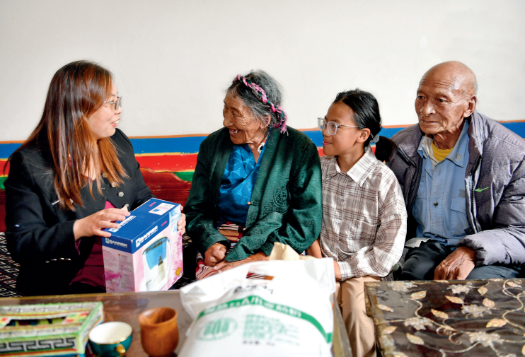 王玉秀(左一)來到拉薩市達(dá)孜區(qū)德慶鎮(zhèn)次旦老人家走訪并送上慰問品(2022 年 7 月 27 日攝) 張汝鋒攝