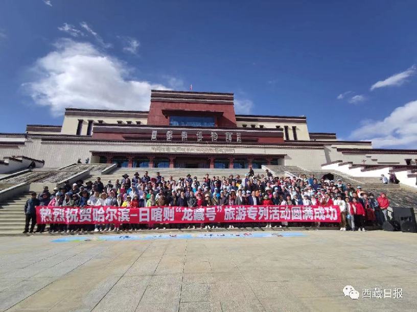 歡迎儀式上,日喀則市領(lǐng)導(dǎo)、市直相關(guān)單位負責(zé)人,黑龍江省第八批援藏工作隊員與游客們在日喀則博物館前合影留念,熱烈祝賀哈爾濱-日喀則“龍藏號”旅游專列活動圓滿成功。