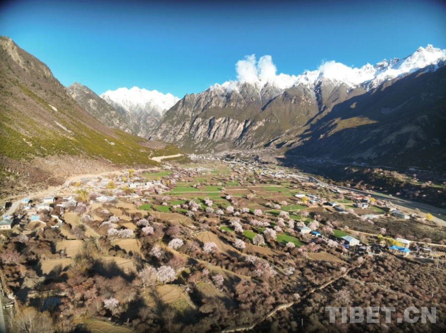 航拍視角下的尼屋春日,野桃林如粉霞般點綴在河谷村落,勾勒出“藏北江南”詩意畫卷 來源:那曲市文化和旅游局