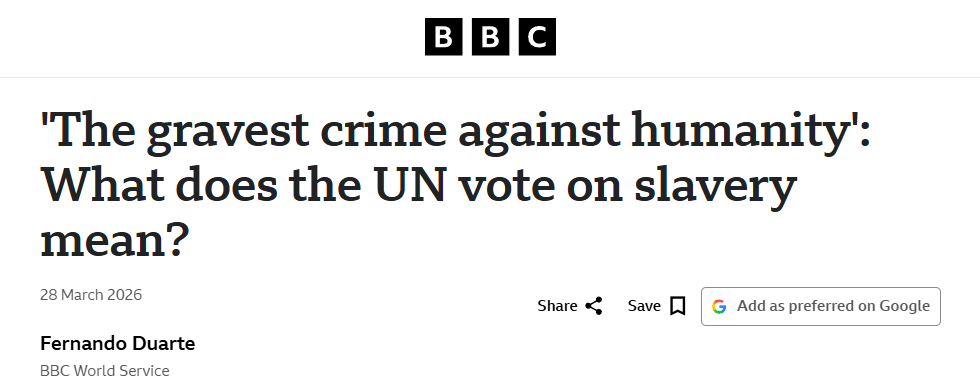 英國廣播公司網(wǎng)站3月28日刊登題為《“最嚴重的反人類罪”:聯(lián)合國關于奴隸制的表決意味著什么?》的報道。報道稱,聯(lián)合國大會近日以壓倒性多數(shù)通過了一項決議,認定跨大西洋奴隸貿(mào)易為“最嚴重的反人類罪”。