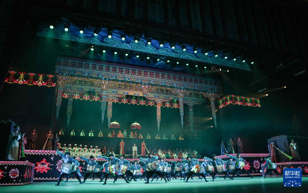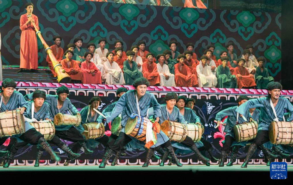 7月19日,在西藏拉薩《緣起象雄·古格遺風(fēng)》情景歌舞詩演出現(xiàn)場(chǎng),演員在表演節(jié)目《鼓樂喧天》。新華社記者 晉美多吉 攝