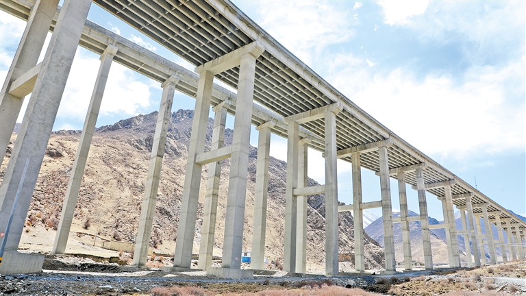 從村里看,一排整齊的高架橋墩像聳立的巨柱一樣,在山里蜿蜒。橋墩托舉著平坦寬闊的公路,從空中穿過,在海拔4200多米的半山腰一頭扎進(jìn)山體里,鑿出兩個山洞,然后貫穿圭嘎拉山,一直延伸到山南去。