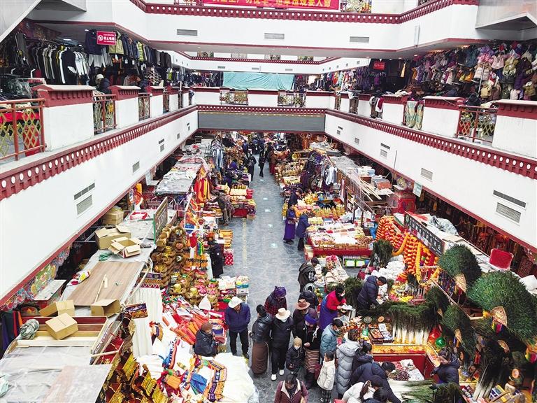 春節(jié)過后,藏歷新年即將到來。北京東路上,熙熙攘攘的人群和商販的叫賣聲交織在一起,整個拉薩街頭洋溢著濃濃的節(jié)日氛圍。2月19日,記者來到八廓商城,從一樓到三樓,前來采購年貨的人絡繹不絕,對聯(lián)、酥油花、糖果、酥油……各類年貨琳瑯滿目,應有盡有。