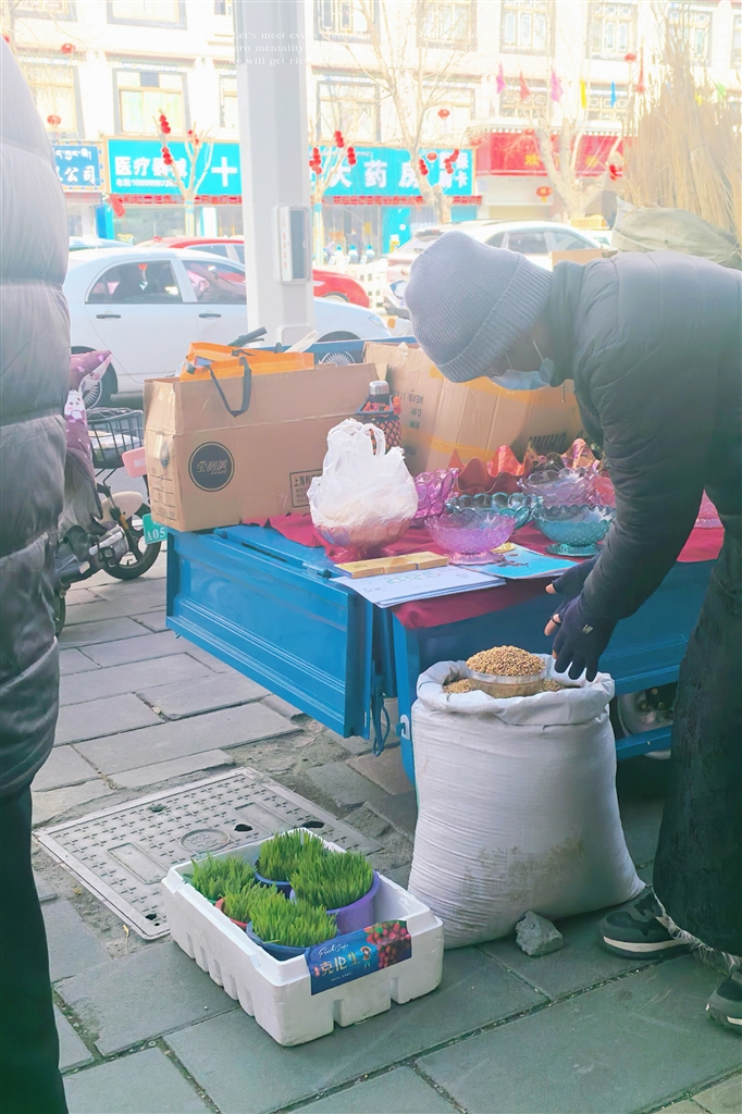 前來(lái)采購(gòu)的格桑卓嘎阿姨,手里提著大包小包,臉上滿是笑意。她買了青稞酒、酥油、風(fēng)干肉還有青稞苗。新年時(shí),用青稞酒祈福,酥油茶招待客人,風(fēng)干牛肉和新鮮軟糯的拉拉、用酥油雕出精美圖案的“推”一起擺盤,供客人隨時(shí)食用。“今年‘古突’和‘朗嘎’是同一天,打算全家圍坐一起吃。家里布置都按習(xí)俗,擺好切瑪、德卡、青稞苗,再給門窗換上新的‘香布’。孩子們買了不少藏文對(duì)聯(lián),說(shuō)是要貼門上,祈福來(lái)年順?biāo)?。帶孩子?lái)傳統(tǒng)市集,就是要讓他們記住咱們藏歷新年的習(xí)俗。這些年,市集多了些漂亮的藏式手工藝品,不過(guò)最有年味兒的,還得是這糌粑和青稞粒的香?!?/p>