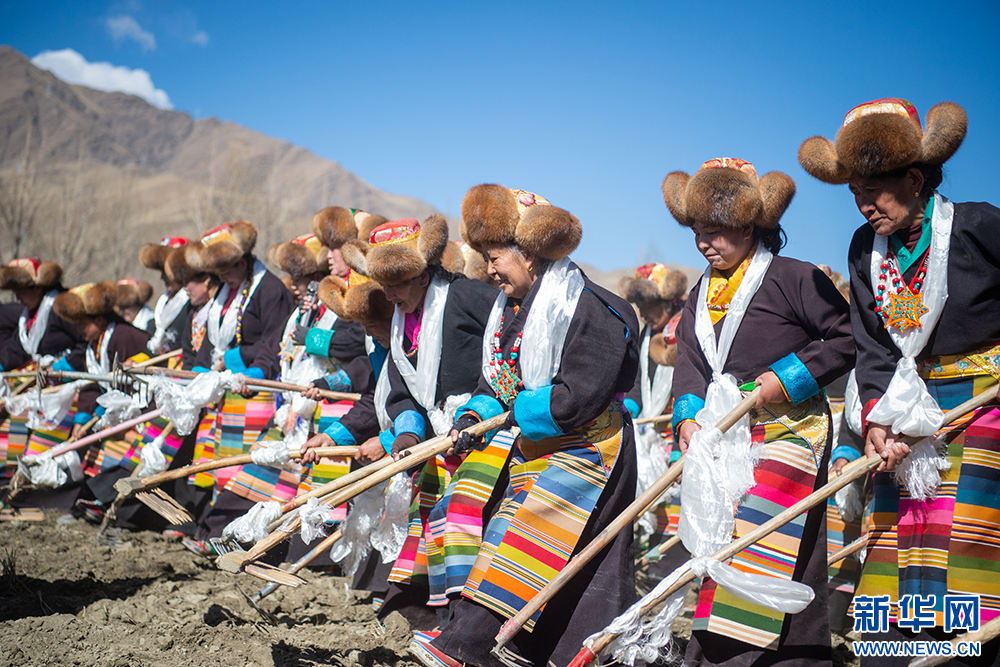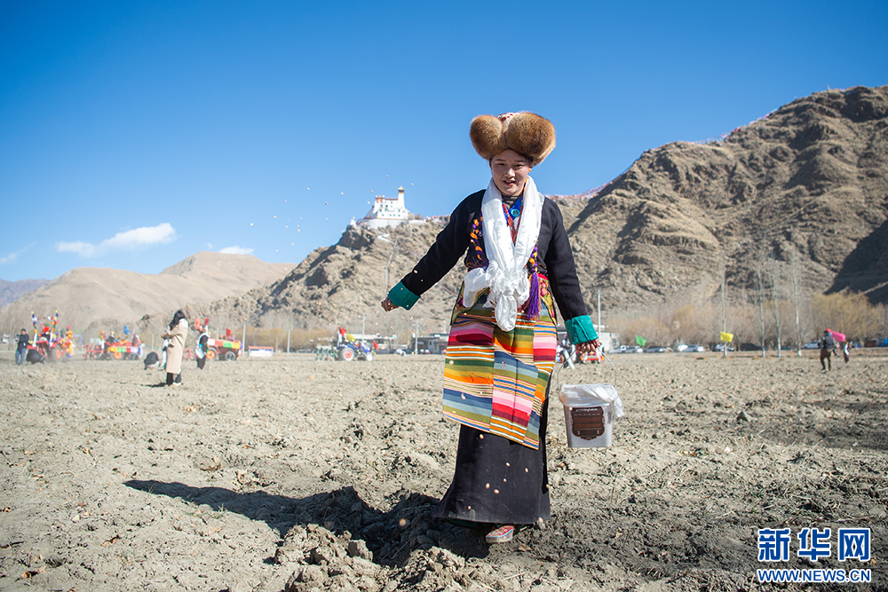 16日,西藏山南市乃東區(qū)門中崗社區(qū)的群眾按照傳統(tǒng)儀式,身著盛裝,手捧青稞酒,在雍布拉康宮殿腳下的西藏“第一塊農(nóng)田”舉行春耕儀式,播撒今春第一粒種子。