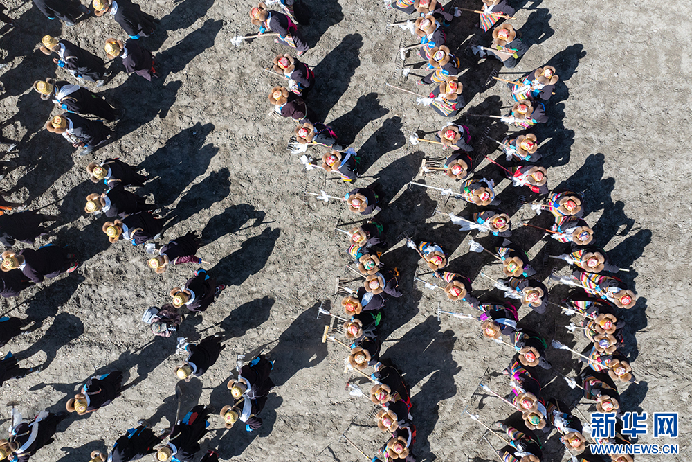 圖為西藏山南市乃東區(qū)門中崗社區(qū)春耕儀式現(xiàn)場(chǎng)(3月16日攝,無人機(jī)照片)。新華網(wǎng) 旦增努布 攝