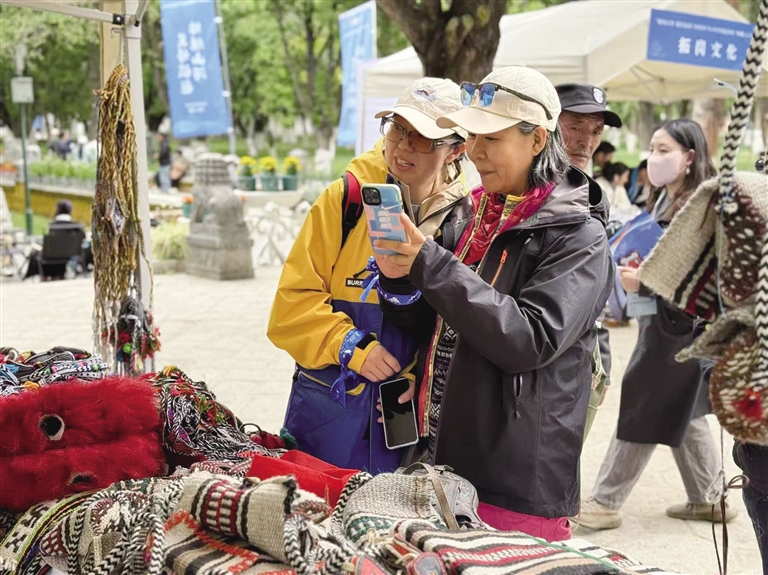 在西藏“非遺”文化體驗區(qū),來自湖南的游客張麗一邊挑選包包一邊感嘆:“哇噻,真的太神奇了!沒想到牦牛毛還可以做成這么漂亮的包包,我要多買幾個帶回去給朋友。還能把這份獨特的文化記憶帶回家?!?/p>