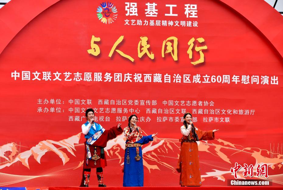 5月25日,由中國文聯(lián)、西藏自治區(qū)黨委宣傳部、中國文藝志愿者協(xié)會主辦的“與人民同行”中國文聯(lián)文藝志愿服務團慶祝西藏自治區(qū)成立60周年慰問演出在位于拉薩的西藏會展中心廣場舉行。藝術家們?yōu)楝F(xiàn)場觀眾帶來歌曲、舞蹈、相聲、朗誦等節(jié)目,把優(yōu)質(zhì)文化服務送到基層一線。圖為歌曲《珠穆朗瑪》演出現(xiàn)場。