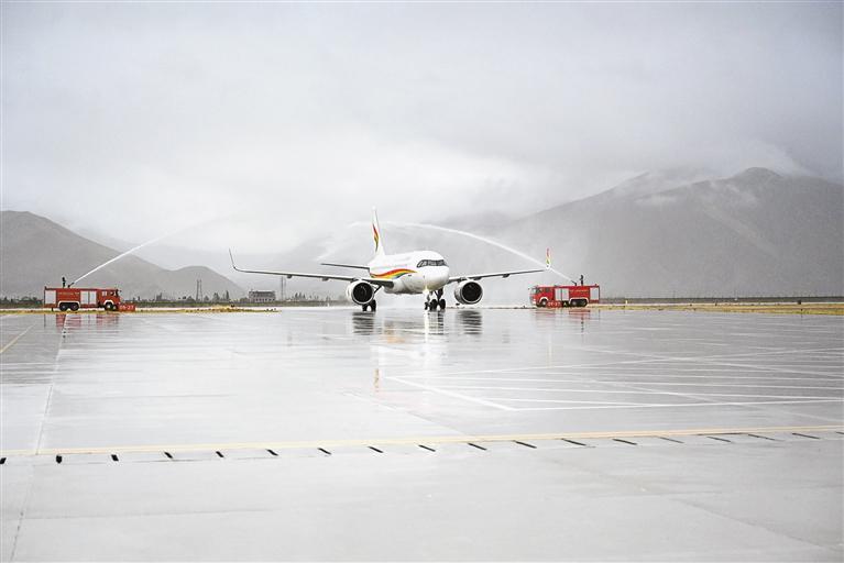 援藏入境旅游包機(jī)在日喀則和平機(jī)場(chǎng)過(guò)“水門(mén)”。