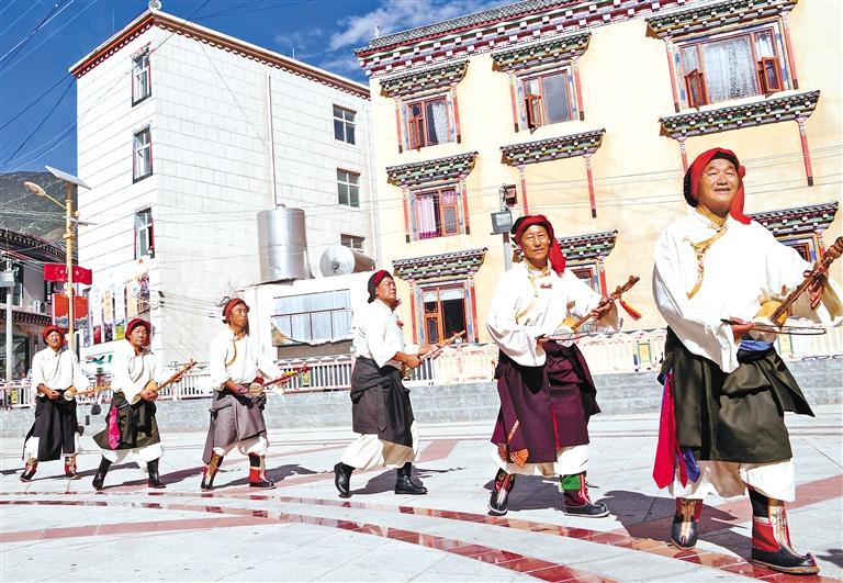 圖為芒康縣納西民族鄉(xiāng)納西村村民身著特色服飾表演芒康弦子舞。記者 洛桑 攝