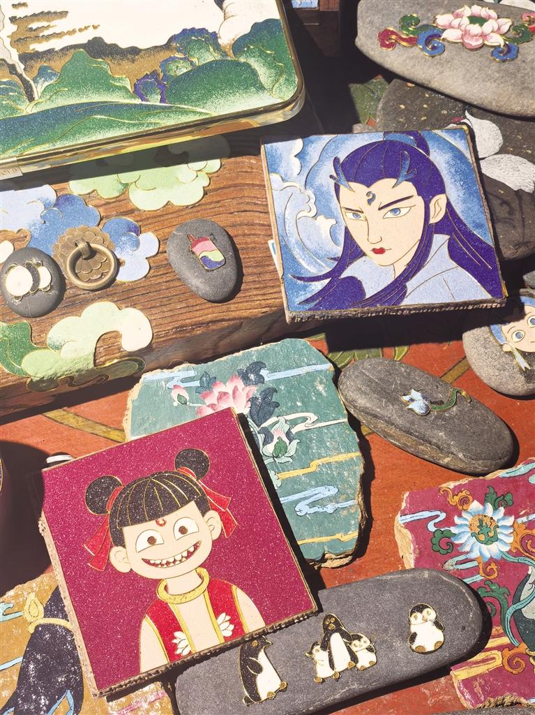 只見占地不到20平方米的小屋內(nèi),擺放著各類唐卡畫作。既有傳統(tǒng)唐卡作品,亦有動(dòng)畫人物的“繪像”。描邊的金屬絲和光滑的質(zhì)感表面讓人忍不住駐足欣賞。店里陳列著巴掌大小的掐絲唐卡,金線掐絲在礦物顏料映襯下流光溢彩。畫師兼老板的南吉合多杰正在完成一份岡仁波齊的客單:“勉薩畫派的特色是線條細(xì)膩,顏色過渡自然。選好圖案后,會(huì)根據(jù)載體材質(zhì)、大小(例如石頭大小、木板長(zhǎng)短等)收費(fèi)?!彼贿呎f著,一邊用特制工具將顏料注入金絲隔斷。