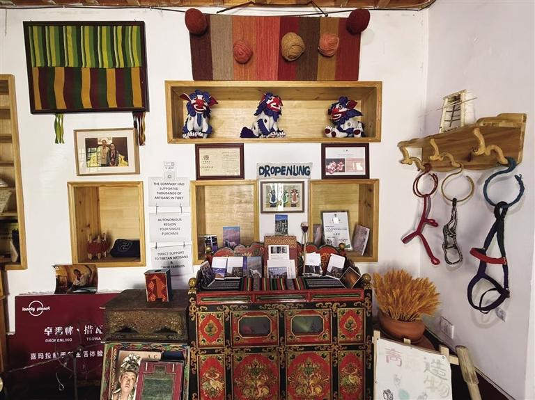 進(jìn)入卓番林,只見狹長(zhǎng)的店面內(nèi)琳瑯滿目地?cái)[著各類富有藏元素的物件,里側(cè)的木質(zhì)貨架上整齊掛著多條不同顏色和格紋樣式的織物,貨架上方擺放著展示手工編織過程的照片。工作人員告訴記者,這些都是可售賣的,除此之外,游客來到這里,還可以體驗(yàn)酥油香皂、酥油唇膏、藏式刺繡等手工DIY。