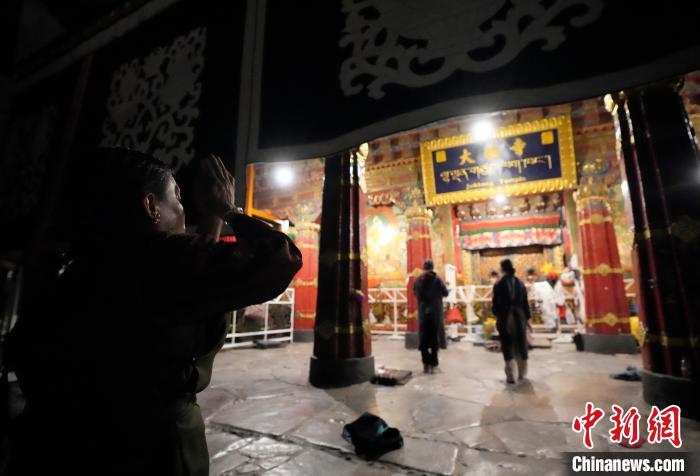圖為當日凌晨,信眾在拉薩大昭寺前磕長頭。中新社記者 李林 攝