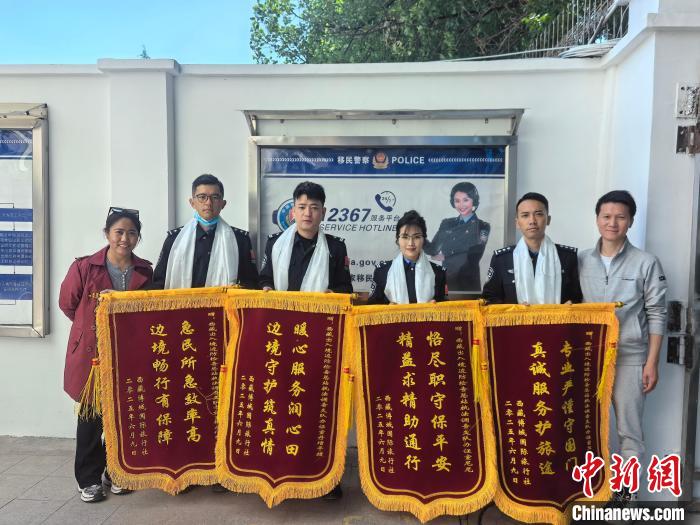 圖為西藏邊檢總站執(zhí)法調查支隊辦證室民警與贈送錦旗人員合影。徐錫萬 攝