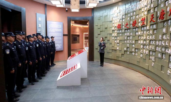 在大唐天竺使之銘陳列館,一塊承載千年歷史的摩崖石刻成為民警們的“第一課”。該陳列館以石刻為核心,通過珍貴文物、歷史文獻(xiàn)與場景復(fù)原,系統(tǒng)呈現(xiàn)了古代邊關(guān)在中外文明互鑒、邊疆治理中的關(guān)鍵作用。民警們仔細(xì)觀看展品,深刻感悟先輩開拓邊關(guān)、守護(hù)疆土的堅韌擔(dān)當(dāng)。