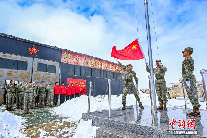 “大國邊疆”育人工程實踐團成員赴西藏日喀則市開展思政調(diào)研,走進“高原戍邊模范營”哨所,與官兵共同舉行升旗儀式。(中國人民大學(xué)供圖)