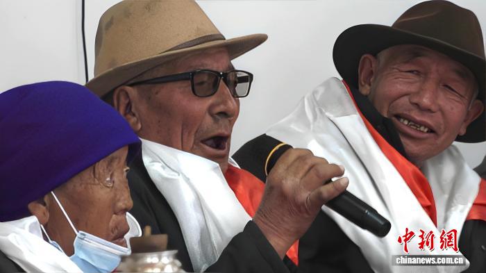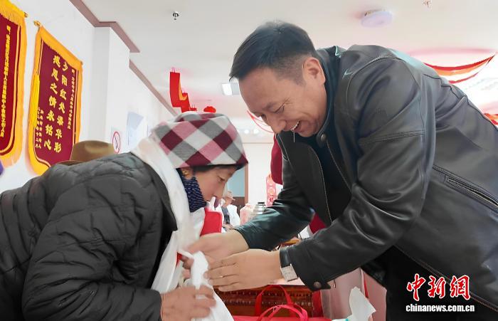 圖為西藏長壽未老社會日間照料服務中心負責人為老人獻哈達、贈慰問品。貢桑拉姆 攝
