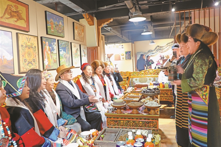 扎西曲登社區(qū)居民邀請游客品嘗青稞酒。