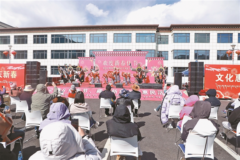 隨后,在社區(qū)劇場內(nèi),雅礱扎西雪巴藏戲精彩上演。演員們頭戴面具、身著華麗戲服,以高亢嘹亮的唱腔和富有張力的動作,演繹著古老傳說。舞臺下,游客們或舉起手機(jī)記錄精彩瞬間,或隨著節(jié)奏輕輕拍手,沉浸在這場獨(dú)具藏式風(fēng)情的“村晚”之中,劇場里洋溢著歡樂祥和的節(jié)日氛圍。