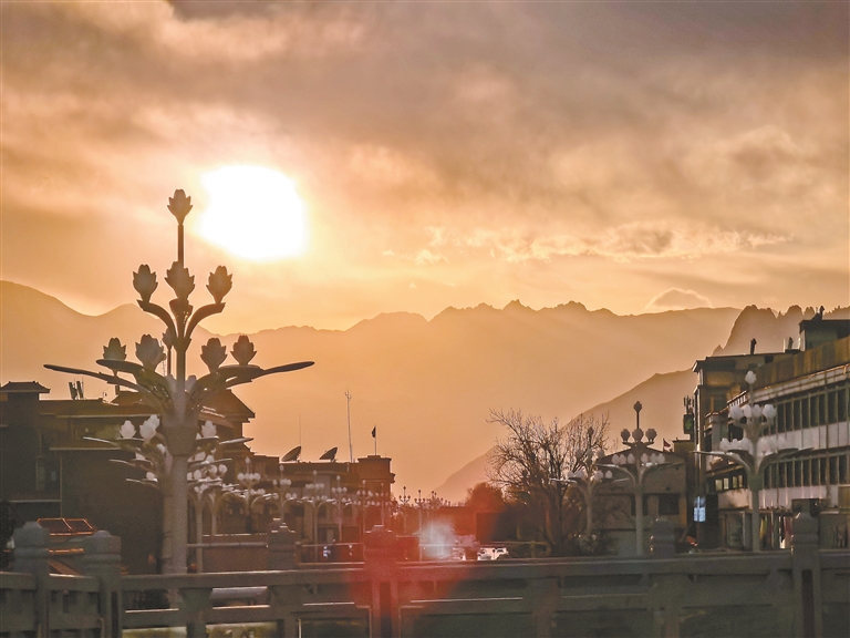 當夕陽的最后一抹余暉染紅天際,拉薩迎來了一天中最動人的時刻。金色的霞光如同融化的金子,從山巒間緩緩傾瀉,為遠處的山脊、城市的街道、錯落的建筑鍍上一層溫暖的光暈。暮色漸濃,煙火氣依舊綿長,這抹落日余暉,是一天忙碌生活的溫柔收尾,也是夜晚靜謐時光的溫柔序曲,讓“日光城”的黃昏,永遠帶著治愈人心的力量,藏著說不盡的溫柔與美好。