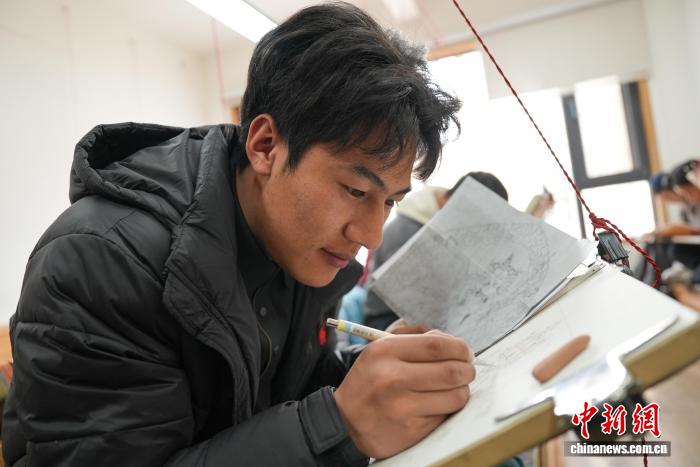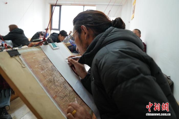 圖為畫室內(nèi)學徒練習繪畫唐卡。貢確 攝