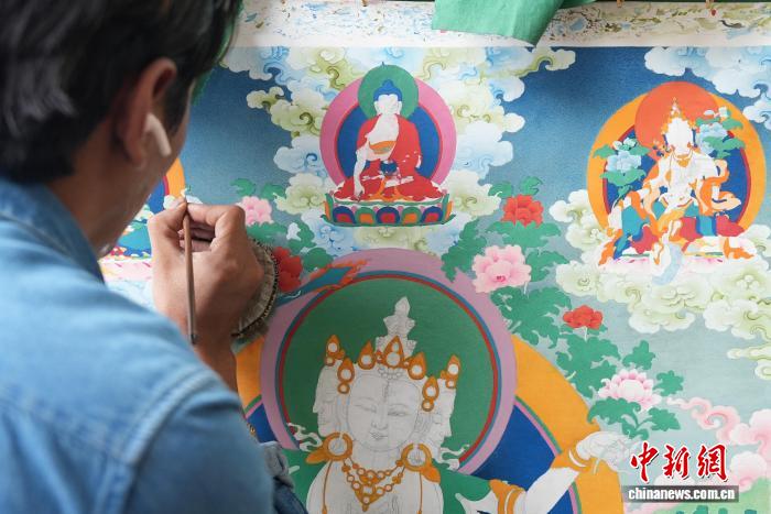 圖為畫師正在繪畫唐卡。貢確 攝