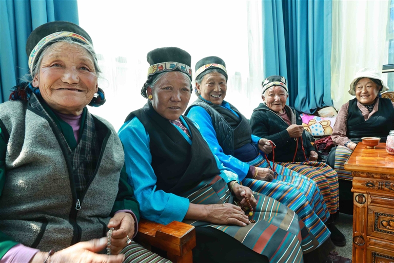 圖為在墨竹工卡縣尼瑪江熱鄉(xiāng)羊日崗村農(nóng)村幸福苑,老人們圍坐一起拉家常。記者 格桑倫珠 攝