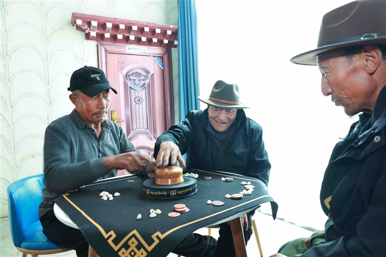 圖為墨竹工卡縣尼瑪江熱鄉(xiāng)羊日崗村農(nóng)村幸福苑里,老人在玩藏式骰子。記者 格桑倫珠 攝