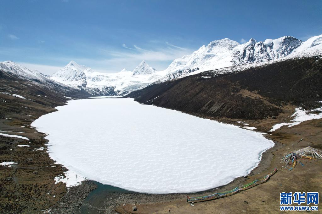 這是5月4日拍攝的薩普雪山和雪山腳下的冰湖(無人機(jī)照片)。新華社記者 孫瑞博 攝