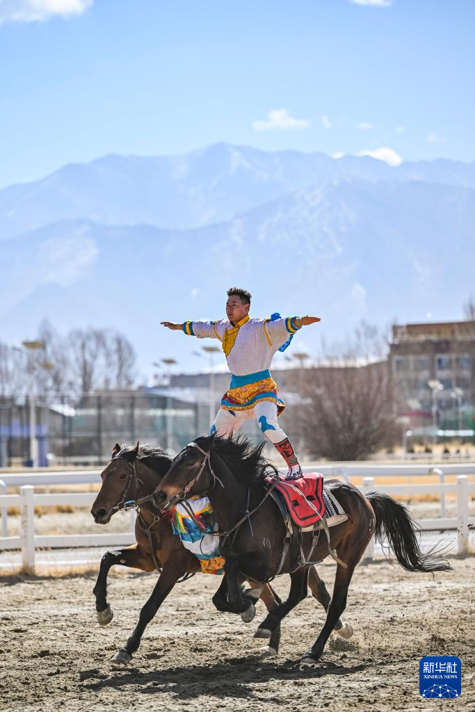 在拉薩賽馬場,騎手進行雙馬單人表演(2月12日攝)。新華社記者 孫非 攝