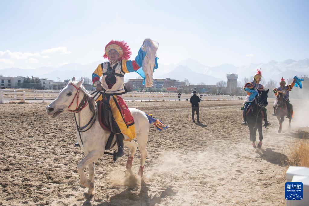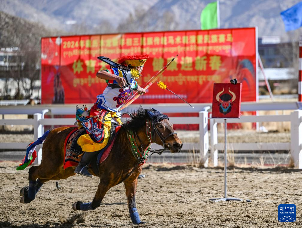 在拉薩賽馬場,騎手表演馬上射箭(2月12日攝)。新華社記者 孫瑞博 攝