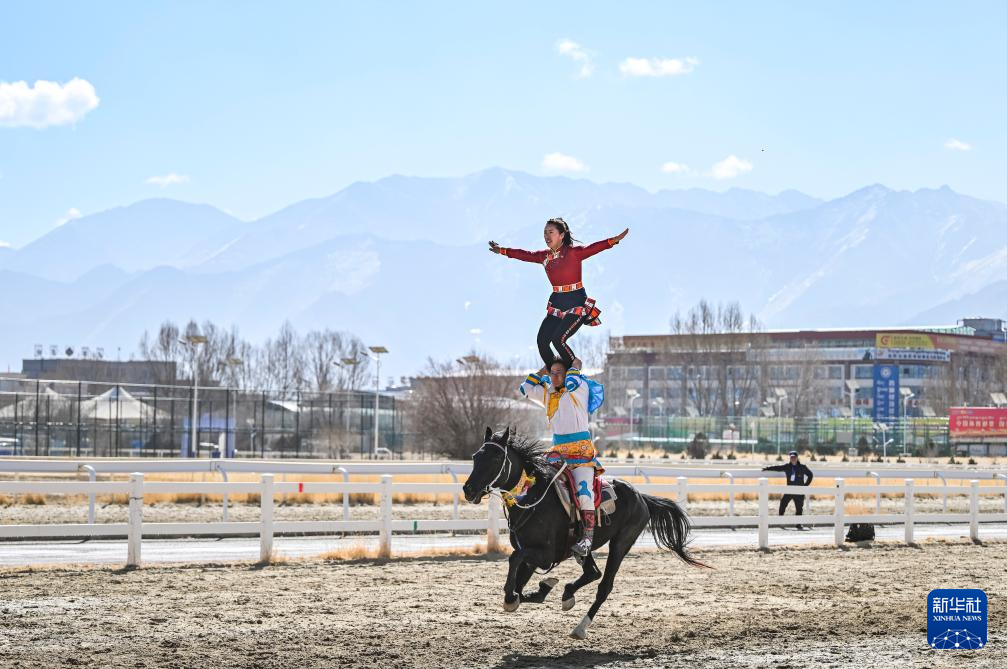在拉薩賽馬場,騎手進行單馬雙人表演(2月12日攝)。新華社記者 孫瑞博 攝