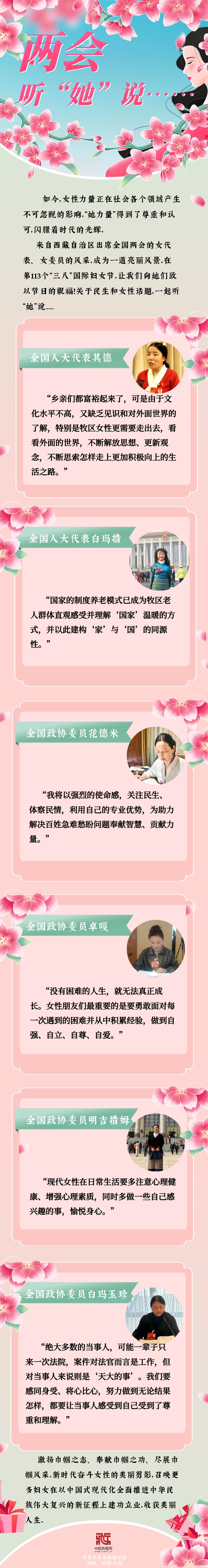 2023年全國兩會,新一屆全國人大代表和全國政協(xié)委員首次亮相。在“三八”國際勞動婦女節(jié)來臨之際,讓我們一起來領(lǐng)略西藏女代表、女委員的履職風(fēng)采![詳細(xì)] -