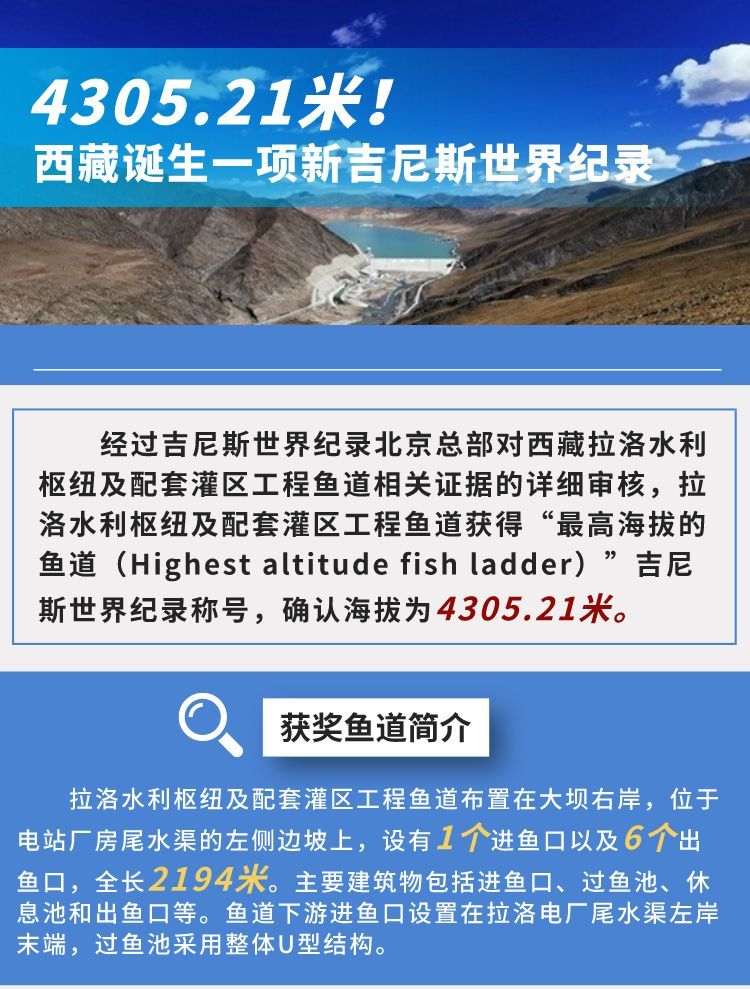 拉洛水利樞紐及配套灌區(qū)工程魚(yú)道獲得“最高海拔的魚(yú)道(Highest altitude fish ladder)”吉尼斯世界紀(jì)錄稱(chēng)號(hào),確認(rèn)海拔為4305.21米。 [詳細(xì)]